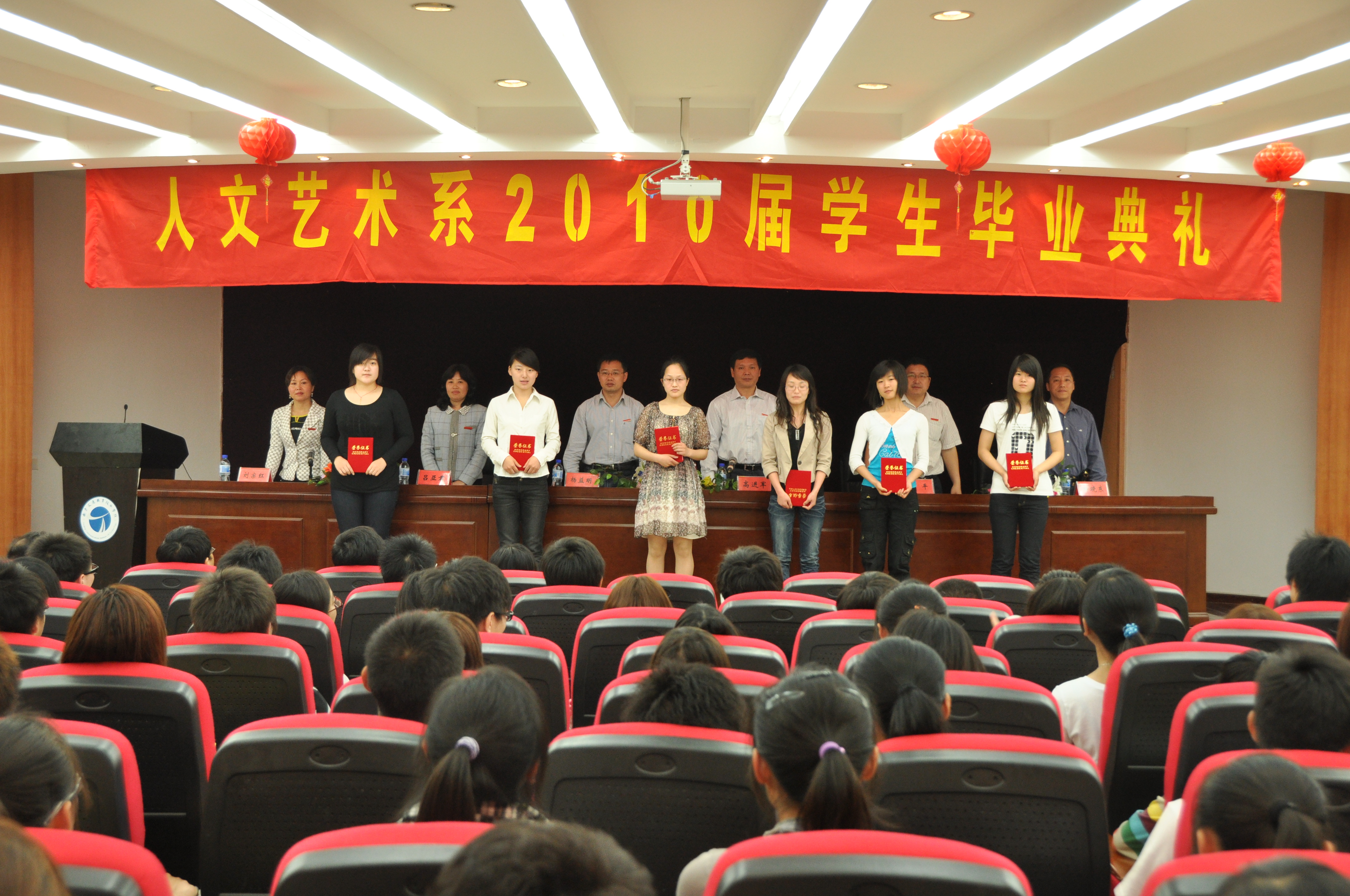 人文艺术系2010届毕业典礼于5月24日上午在明德楼报告厅隆重举行。学院高进军副院长、教务处杨益明处长、学工处王平处长、系吕亚君主任、系杨晓东书记、系刘宗红副主任参加了典礼。2010届全体毕业生、毕业班班主任及在校师生代表参加了毕业典礼。典礼由刘宗红副主任主持。