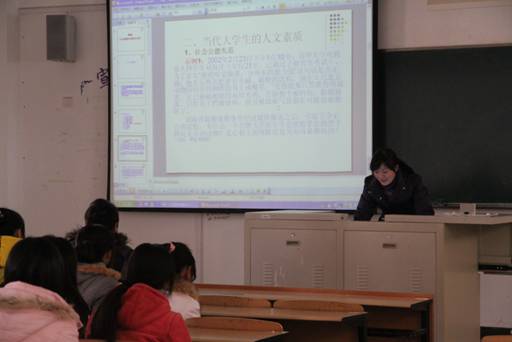 2011年12月28日,由人文艺术系举办的 “当代大学生与人文素质”讲座在多媒体教室举行。主讲者宋玲艳老师通过列举大学生中存在的种种不良现象,并对其原因进行分析,以中国传统文化为主线,阐述了儒家的“仁爱”、“ 中庸”、“孝亲”等思想和道家关于“人性修养”、“处世哲学”、“人与自然”等观念。