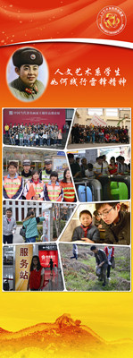 人文艺术系学生结合专业特色制作了富有人文艺术特色的雷锋精神宣传系列海报5张,利用展板、网站、微薄、微信等形式在系部学生乃至校园内进行广泛的雷锋精神的弘扬和宣传,并且@到江苏共青团和学校团委。