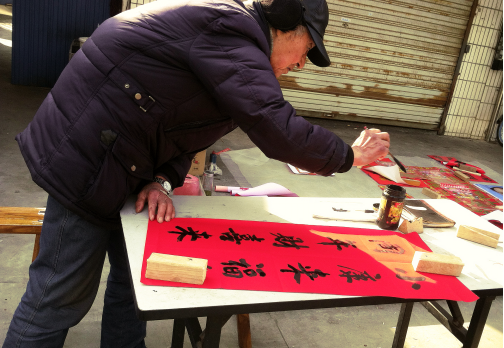 大年三十的街边,很多小贩在卖春联,花花绿绿铺了一地,各种叫卖和讨价还价。却有位老人安静呆在一边,手执毛笔在一笔一划自己写春联,没有毛毡砚台,也不是什么好笔好墨,甚至没有像样的桌椅;阳光洒在桌上,老人一脸笑意,笔端划下的,是对生活最殷切的企盼,这不就是春联最原始的意义吗?