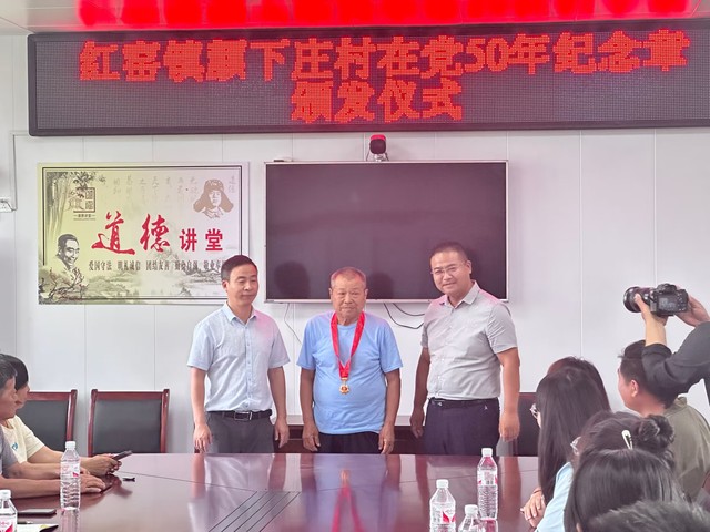 在中国共产党建党102周年华诞来临之际,我系“研学筑梦,一路生花”乡村振兴实践团的师生们有幸见证了颜下庄村“光荣在党50年”纪念章颁发的光荣时刻。“光荣在党50年”纪念章,凝聚着党和人民对老党员的感激之情,承载着老党员的光荣与担当,既是对党员不忘初心的诠释,也是对党员增强“四个意识”、坚定“四个自信”,做到“两个维护”的有力鞭策。在场的师生们无不深受感触,纷纷表示在党50年,风雨50载,从满头青丝到银发生辉,老去的是岁月,不变的是对党的忠诚。而作为新时代的中国青年,要学习老党员前辈们“一颗红心永向党”的政治品格、“以身示范敢为人先”的担当魄力和“撸起袖子加油干”的奋斗精神,继承和发扬老党员的爱党爱国之情与踏实奋斗的历史积淀,把初心和使命铭记于心、践之于行!
