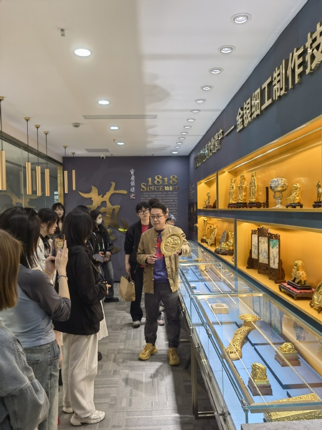 师生们在我乐家居股份有限公司参观了设计研发和产品展示中心,身临其境感受了家居行业的变革与创新。在高淳陶瓷股份有限公司,大家不仅学习到陶瓷的历史和艺术价值,参观了高淳陶瓷国家用瓷生产线,了解陶瓷制作全过程和现代化陶瓷技术的发展。在江苏宝庆珠宝股份有限公司,参观了国家级金工非遗大师工作室,师生们见证了传统银器工艺的精湛,现代珠宝设计的创新和发展,并探讨了校企共组竞赛,共参竞赛的路径。扬州非遗珍宝馆、南京民俗博物馆丰富的文物藏品让师生们对如何通过文化创意产品将传统文化资源转化为市场价值有了更深的理解,通过驻馆非遗大师的分享与交流,帮助同学们明确了职业晋升与发展的路径。
