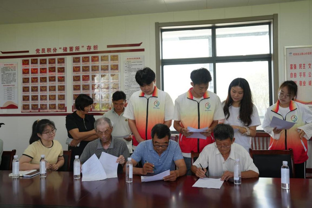 实践团一行来到颜下庄村党群服务中心,受到了村干部的热情接待。如今的颜下庄村,村容整洁、环境优美,村民在池边垂钓,孩子们在森林氧吧玩耍,特色产业腾飞发展,一首“和美与共”的乡村振兴协奏曲正在颜下庄村的土地上缓缓奏响。正如队员王岳此次赠送给颜下庄村的书法作品中写的那样——生态新农村,醉美颜下庄。队员们还走村入户,发放并收集整理乡村振兴调查问卷。整份问卷围绕产业兴旺、生活富裕、生态宜居、治理有效等多个板块,细分了几十个问题,队员们也将调查结果及时反馈给了村干部。