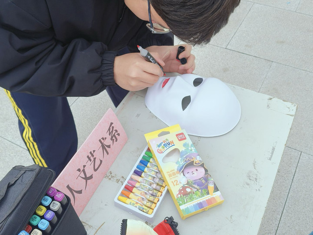 活动现场,“七彩人”志愿服务队的志愿者们热情地向大家介绍了本次活动的流程。活动现场各式各样的面具整齐排列,等待着它们的“创造者”赋予生命。现场还精心准备了五彩斑斓的颜料与各式各样的画笔,活动现场洋溢着浓厚的艺术气息与勃勃的创造活力。