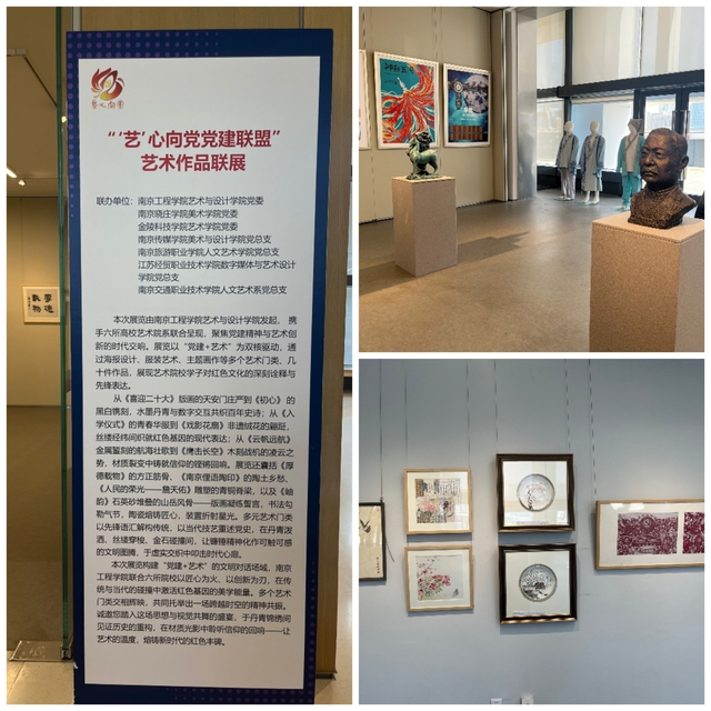 为创新开展党建工作,构建校校、校地协同育人新格局,人文艺术系党总支与南京工程学院艺术与设计学院党委、南京晓庄学院美术学院党委、金陵科技学院艺术学院党委、江宁区淳化街道党工委、江宁区横溪街道党工委、南京传媒学院美术与设计学院党总支、南京旅游职业学院人文艺术学院党总支、江苏经贸职业技术学院数字媒体与艺术设计学院党总支、百家湖文化中心党支部等九家单位党的基层组织,联合组建了“艺心向党”党建工作联盟。4月18日上午,联盟在江宁美术馆举行“‘艺’心向党党建联盟”成立仪式,并举办了首场活动—联盟单位学生艺术设计作品联展。
